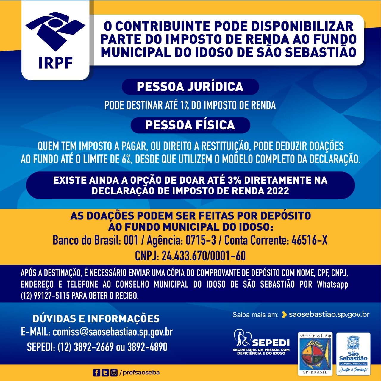 O Conselho Municipal do Idoso (COMISS), Prefeitura de São Sebastião informam que é possível doar parte do imposto devido, ao Fundo Municipal do Idoso, diretamente na Declaração do Imposto de Renda (IR).