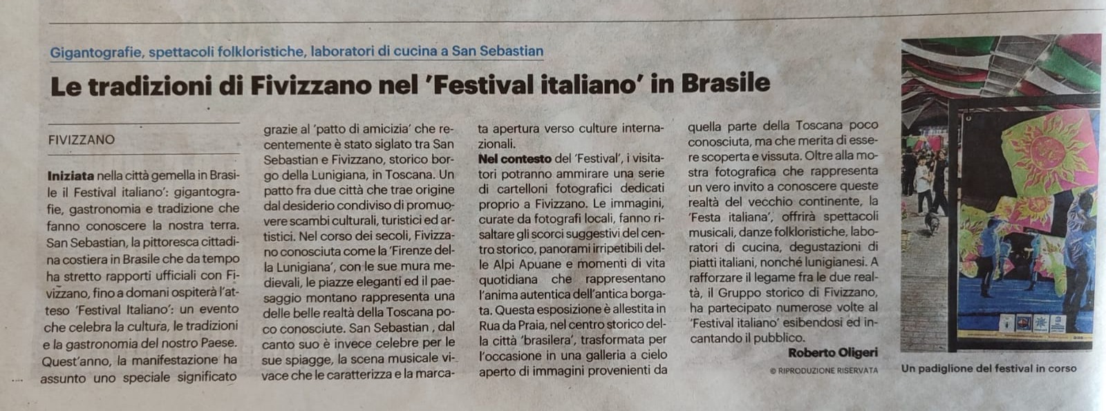 A matéria, intitulada ‘Le tradizioni di Fivizzano nel Festival italiano in Brasile’, destaca o sucesso do festival como uma importante vitrine das tradições italianas, com apresentações remetentes a Itália, culinária tradicional, entre outras atividades que retrataram as belezas e a história da Toscana.