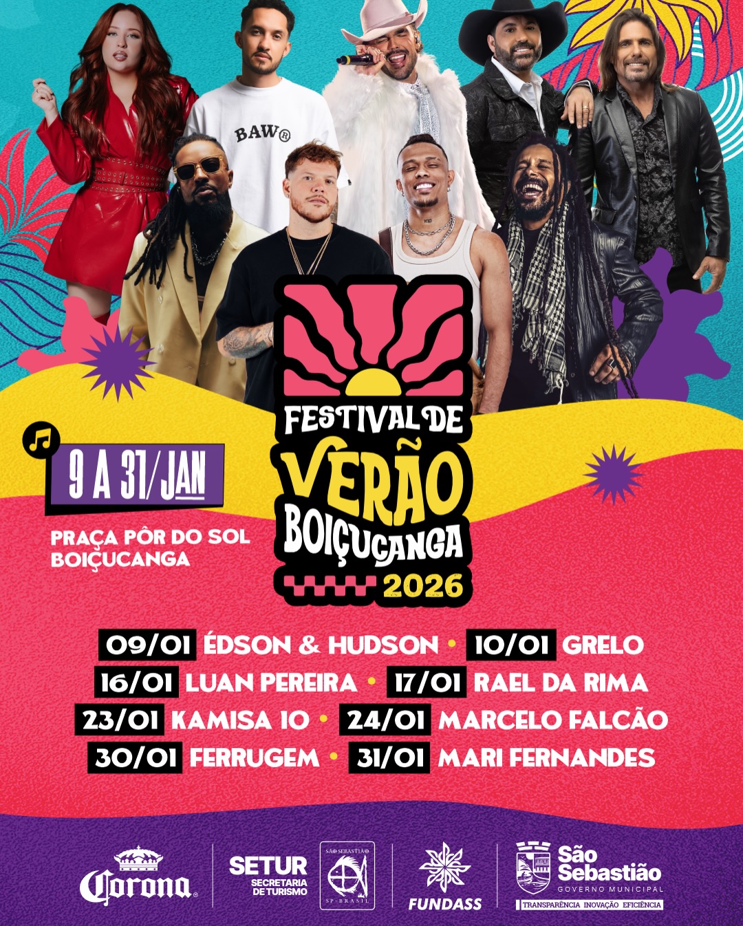 Os eventos serão divididos entre dois pontos estratégicos da cidade: o Complexo Turístico da Rua da Praia, na região central, e a Praça Pôr do Sol, em Boiçucanga, na Costa Sul.