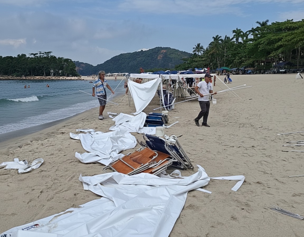 A prefeitura de Ubatuba sancionou neste ano uma lei que proíbe a instalação de tendas, barracas, gazebos e estruturas similares em todas as praias do município. A norma, aprovada pela Câmara em 29 de abril de 2025 e publicada em 30 de maio, entrou em vigor após ser promulgada pelo Legislativo. A regra mantém exceções para guarda-sóis e eventos autorizados, mas prevê multa de R$ 1 mil e apreensão dos equipamentos para quem descumprir.